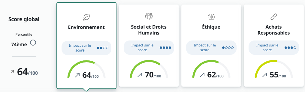 Ecovadis vient ainsi évaluer la performance de l’entreprise sur 4 thèmes majeurs : environnement, éthique, droits humains et achats responsables. Plus d’une cinquantaine de questions permettent ainsi d’affiner la mesure. Pas de déclaratif, que des preuves pour voir les réponses validées.