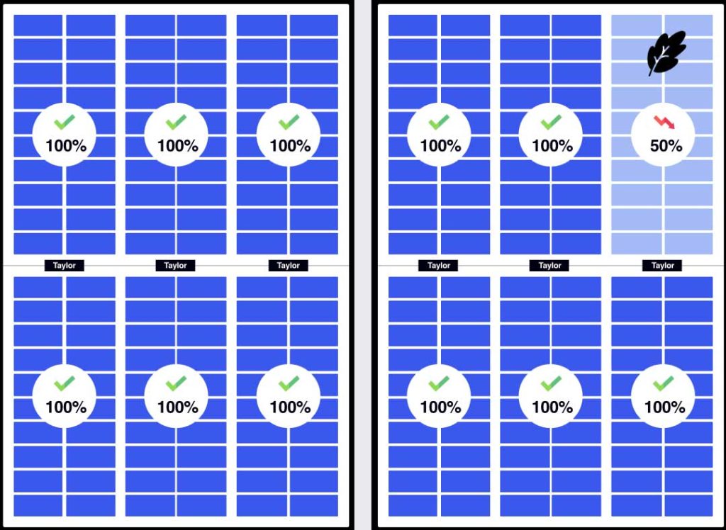 Sur les panneaux solaires dits ordinaires, l’ombrage local et le vieillissement viennent limiter le rendement d’une cellule solaire individuelle. Un ombrage qui peut être provoqué par des feuilles, cheminées ou encore fissures de cellules. Dans des cas extrêmes, cela peut provoquer des court-circuits et donc des points chauds. Si les micro-onduleurs permettent d’ores et déjà de réduire l’impact de ce type d’aléa, ils ne le font qu’à l’échelle du panneau. Ainsi, même si une partie du panneau est impactée, c’est l’ensemble du module qui voit son rendement chuter. C’est là où la technologie Taylor prend tout son sens.